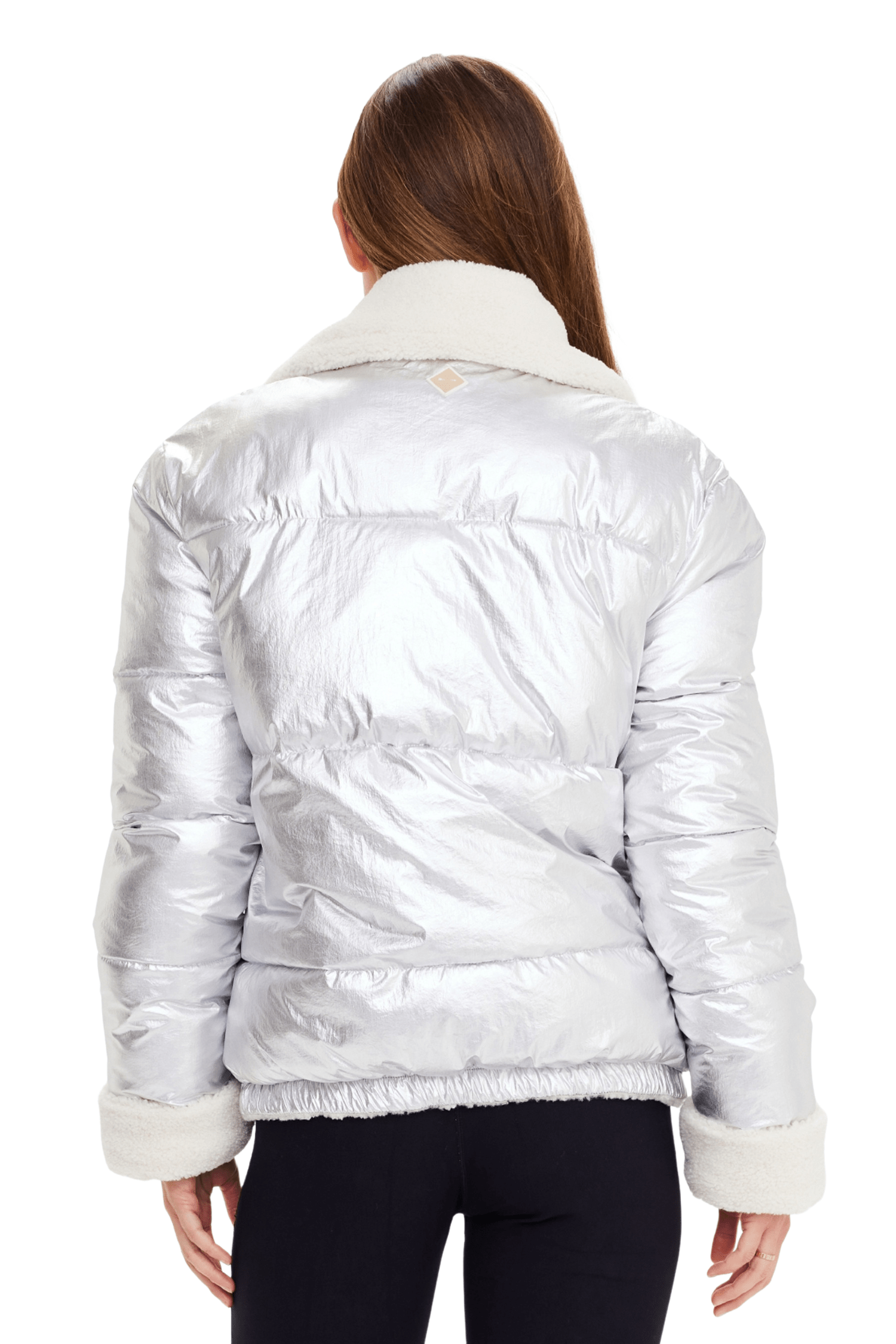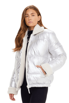 - Reversible quilted puffer jacket in silver metallic fabrication and faux shearling reverse