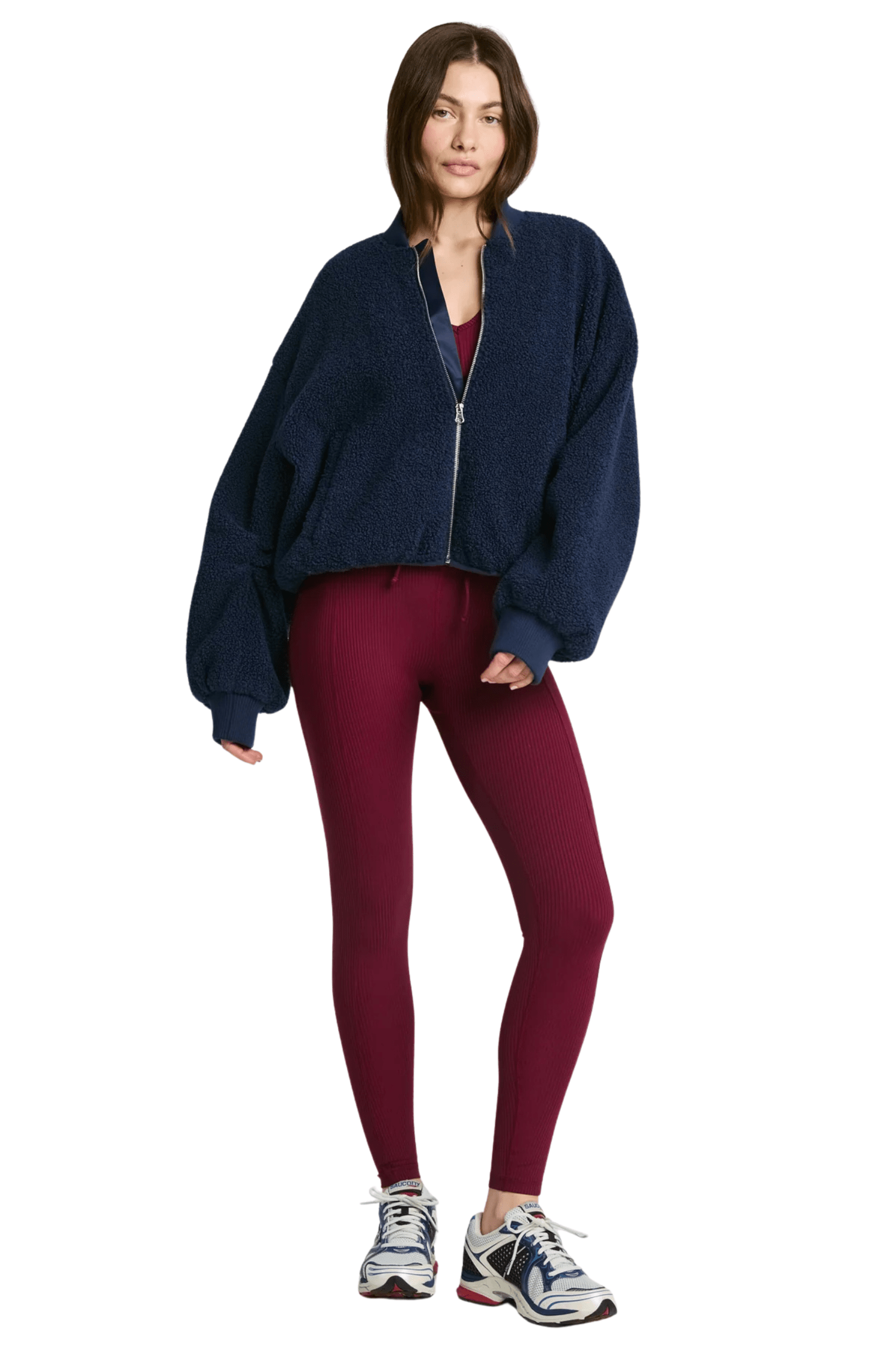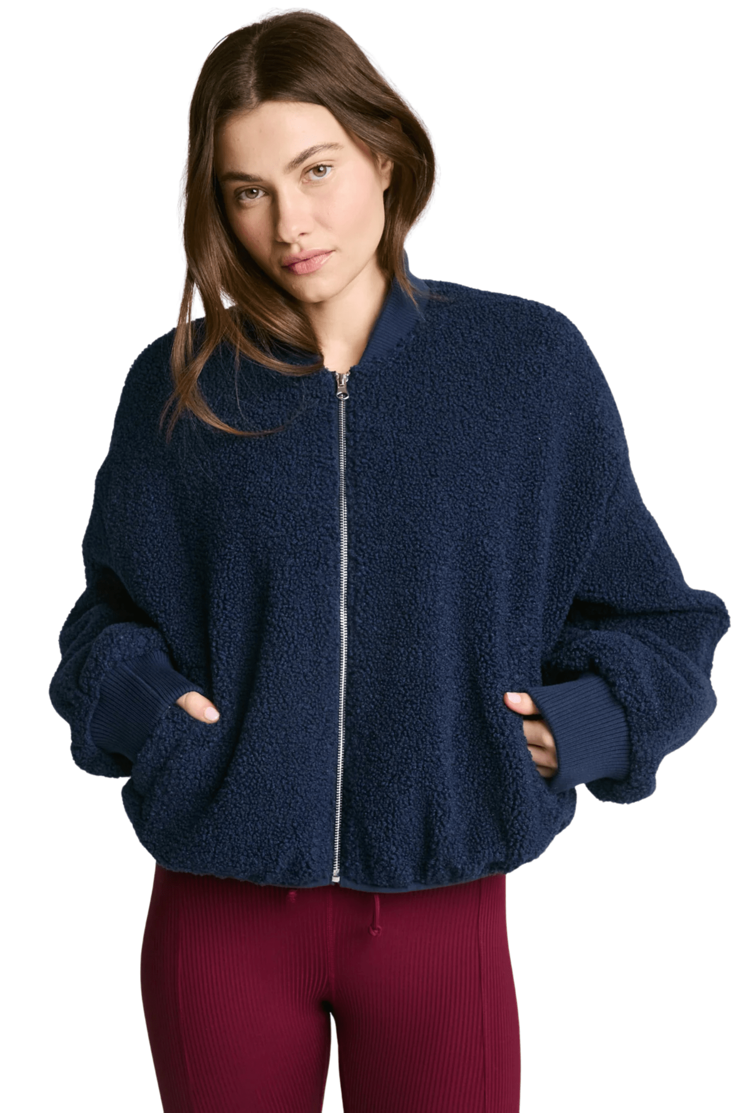 • Oversized sherpa bomber jacket with varsity-inspired vibe