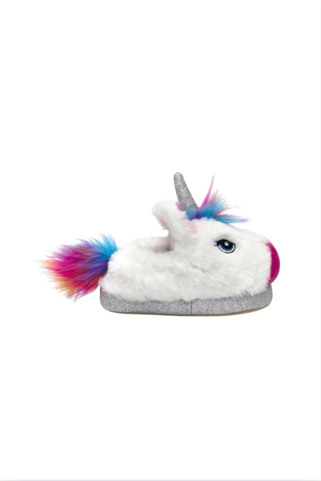 - Plush faux fur unicorn motif with 3D ears, horn, and tail