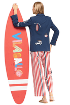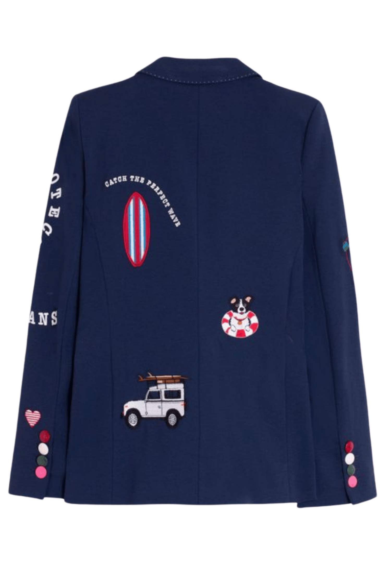 - Small multicolor embroideries on front and sleeves (surfboard, car, dog)