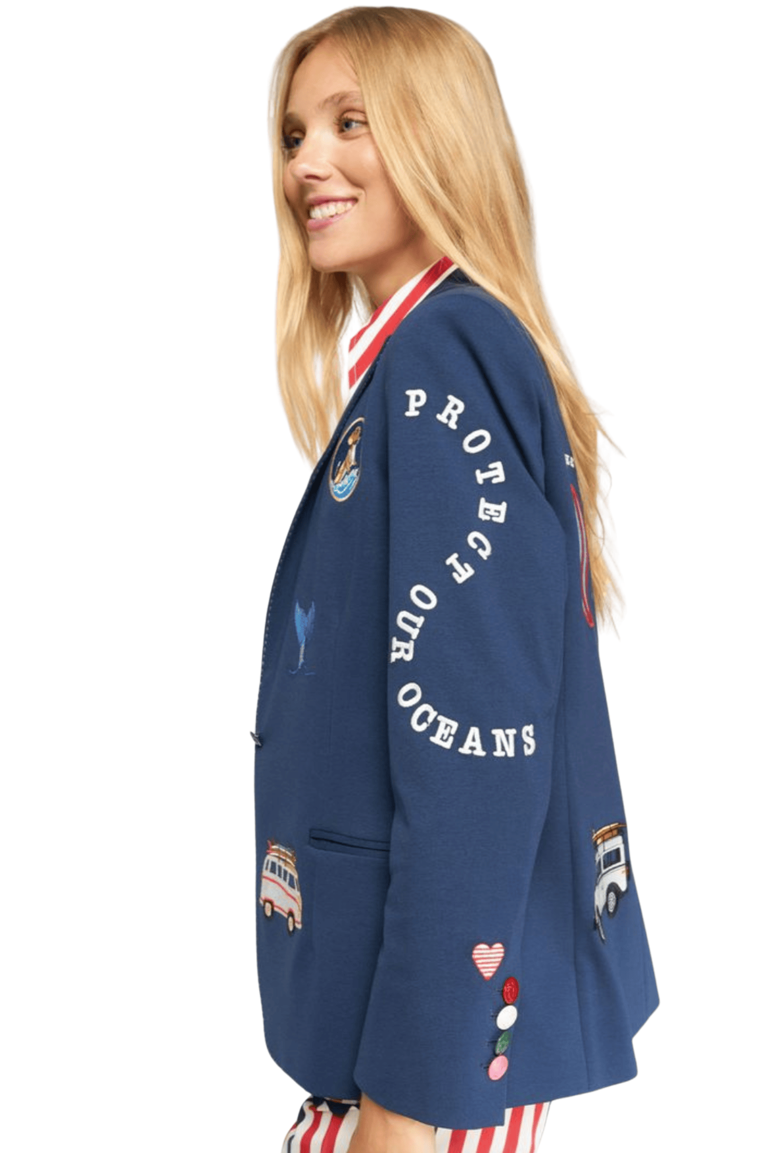- Tailored navy blazer with notched lapels and double-breasted front