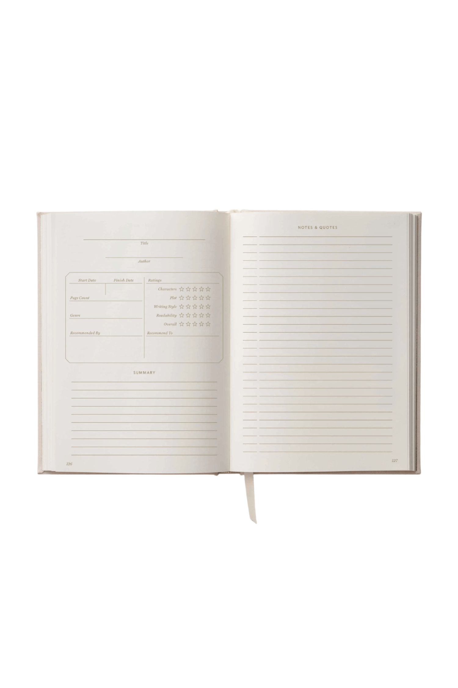 - Sections for books to read, reading log, books borrowed/lent, reviews, and notes