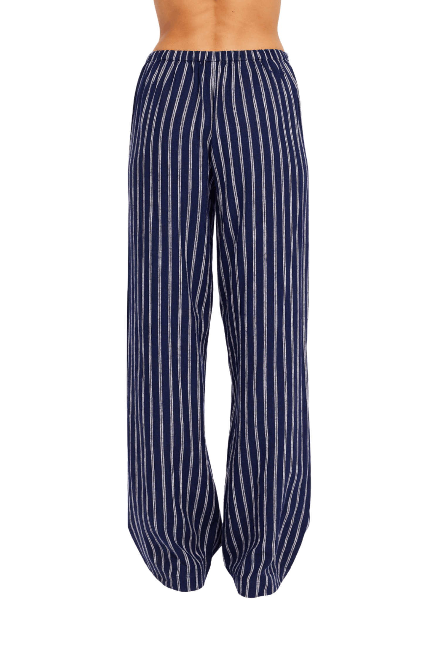 - Linen fabrication in a navy and white yarn dyed stripe