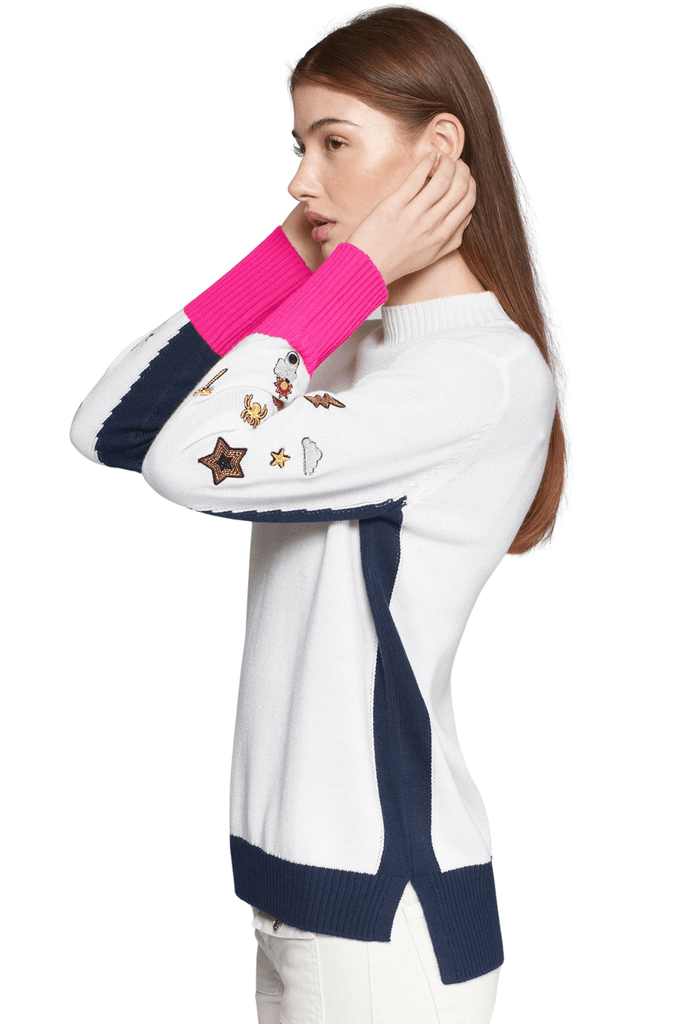 - White sweater with navy blue sides and fuchsia pink cuffs