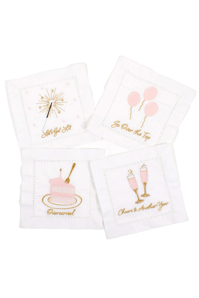 Crisp white napkin set with fun embroidery stitched on each